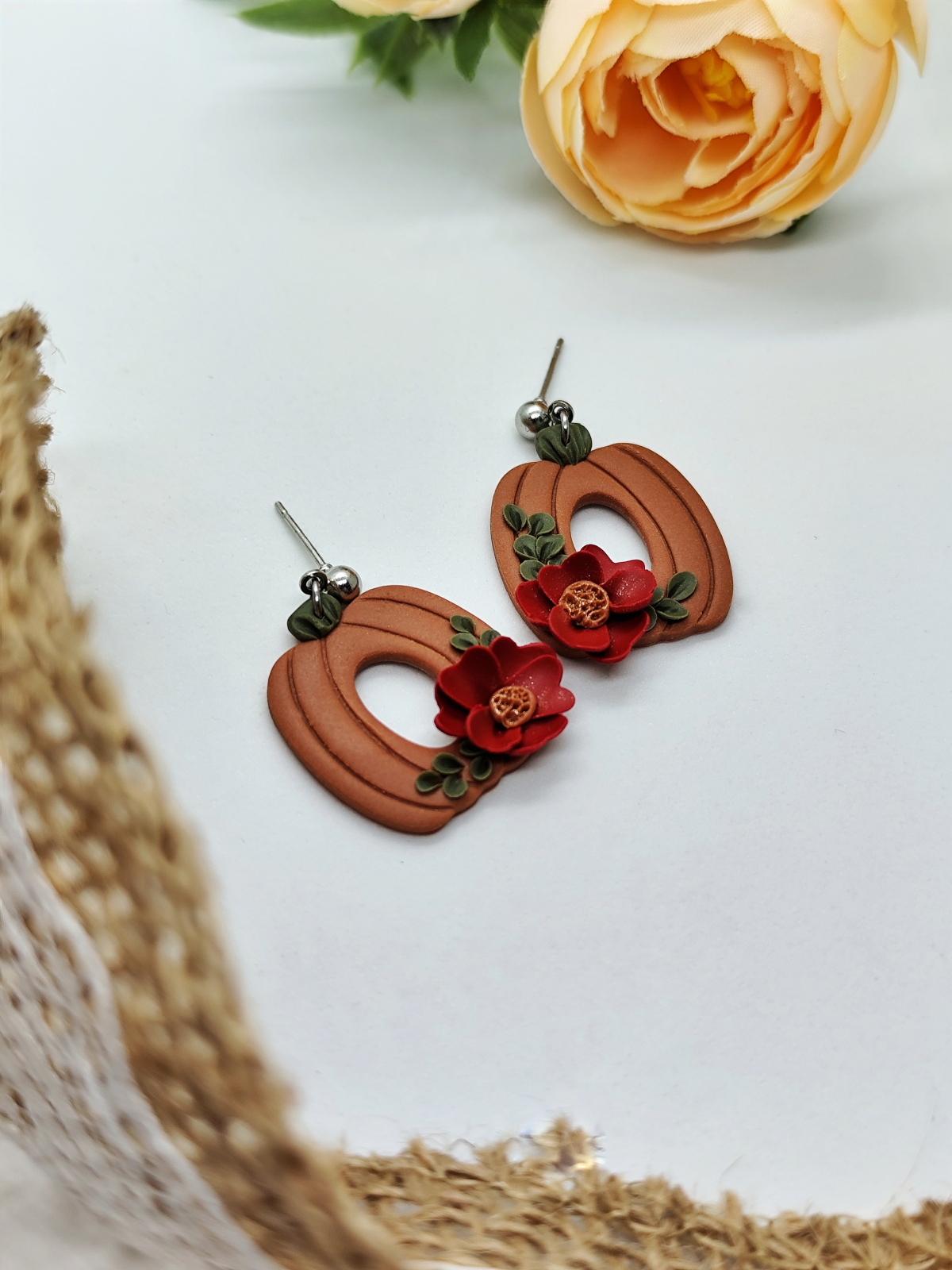 Cercei modelați manual din lut polimeric, cu decor floral. Elemente din oțel inoxidabil hipoalergenic.
